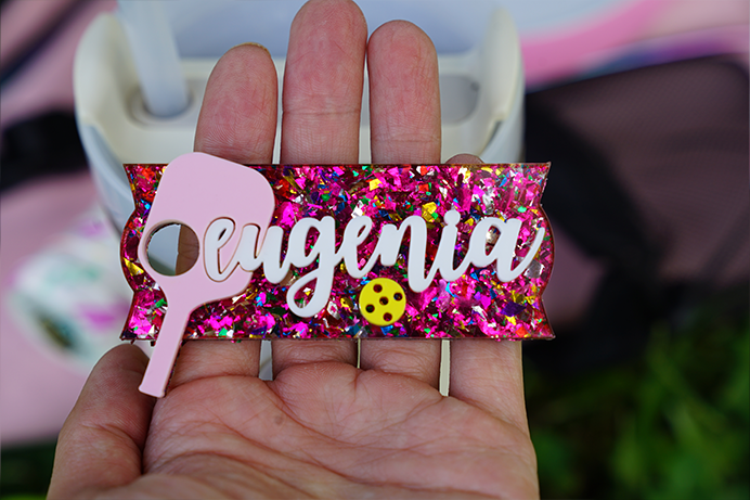Names will be in white as this is the most visible with the back glitter options and cursive. Depending on the length of your name, placement of your name and pickleball will differ. Pickleball will be yellow.