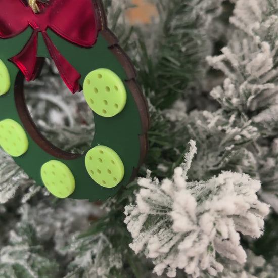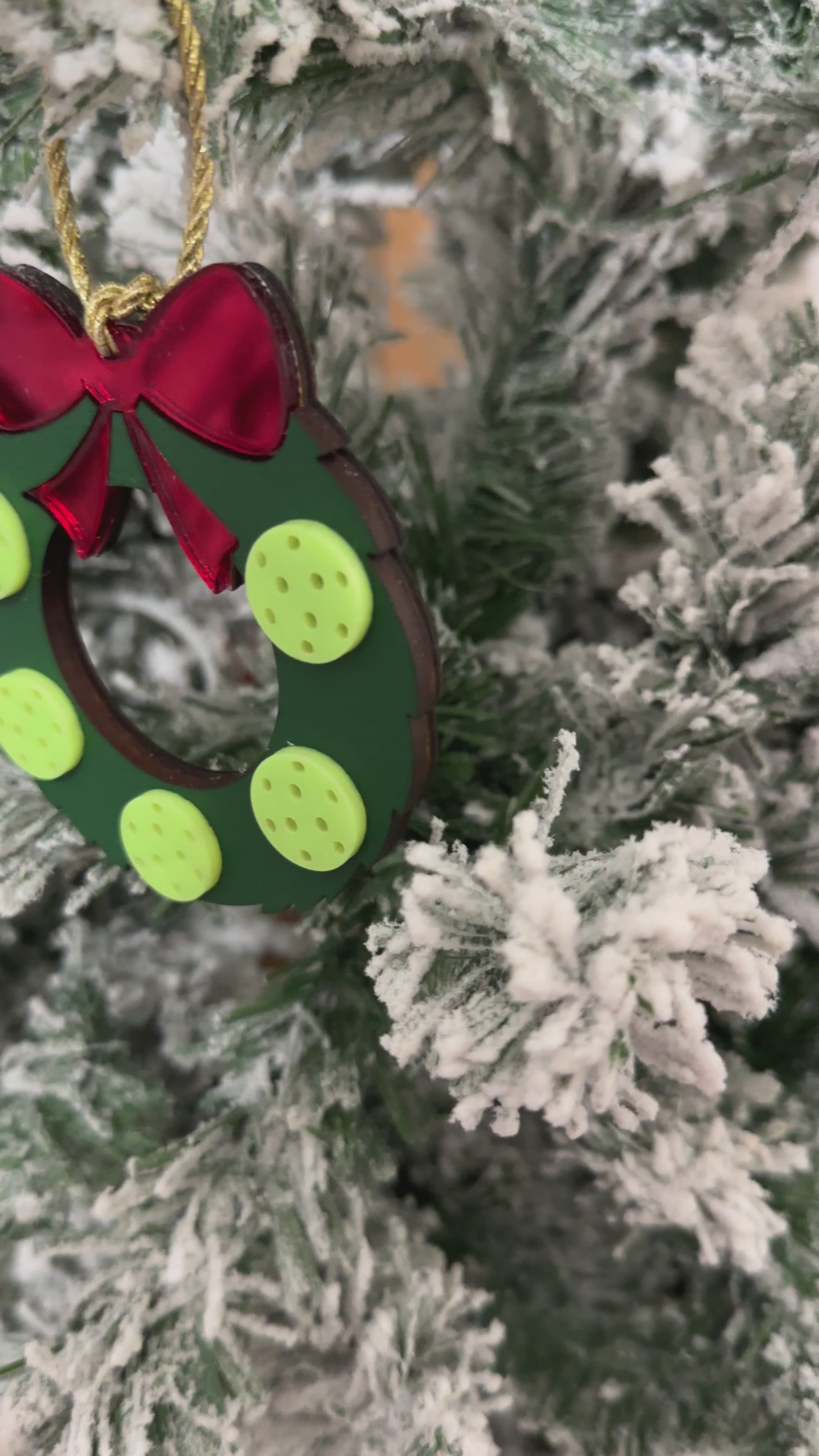 Design: Features a wreath design made from wood and hand painted with acrylic pickleballs and red bow.